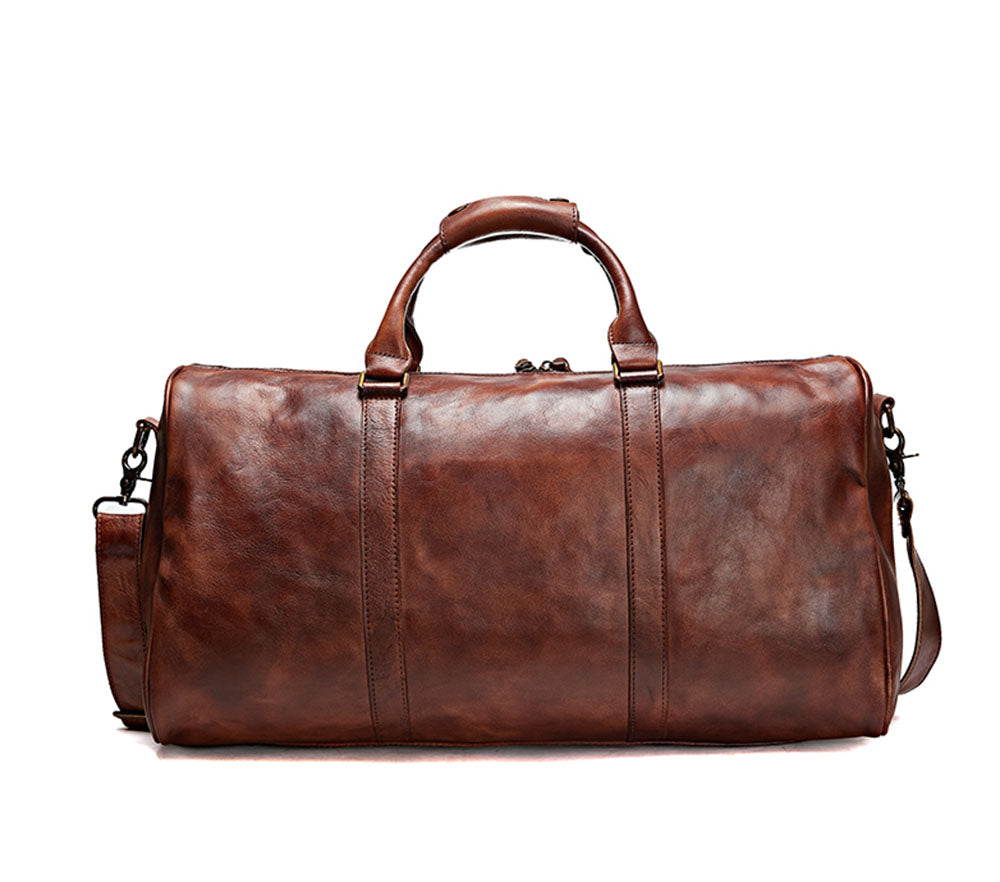 Ontdek de perfecte reisgenoot  onze vintage weekender duffle tas van 100% plantaardig gelooid kalfsleer. Deze luxe lederen reistas combineert tijdloos design met praktische indeling en is ideaal als handbagage, sporttas of overnight tas. Met een formaat van 50 x 26 x 21 cm biedt de duffel voldoende ruimte voor kleding, schoenen en een 16-inch laptop. De stevige dubbele handvatten, afneembare schouderriem en zwarte metalen details zorgen voor comfort en een stijlvolle uitstraling. Binnenin vind je een ritsvak en een open vak om je essentials georganiseerd te houden. Perfect voor zakenreizen, weekendjes weg en dagelijks gebruik. Kies voor duurzaamheid, kwaliteit en klasse met deze authentieke leren duffel bag geleverd met stofzak en tags.